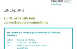 6. Jahreshauptversammlung des Vereins zur Förderung des Gemeinwohl Ökonomie in Vorarlberg Datum: Freitag, 25.11.2022 Zeit: 18:30 Uhr – 20:30 Uhr Ort: Freihof Sulz Schützenstraße 14 A-6832 Sulz
